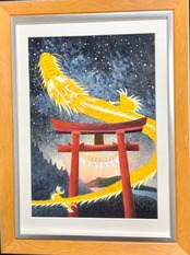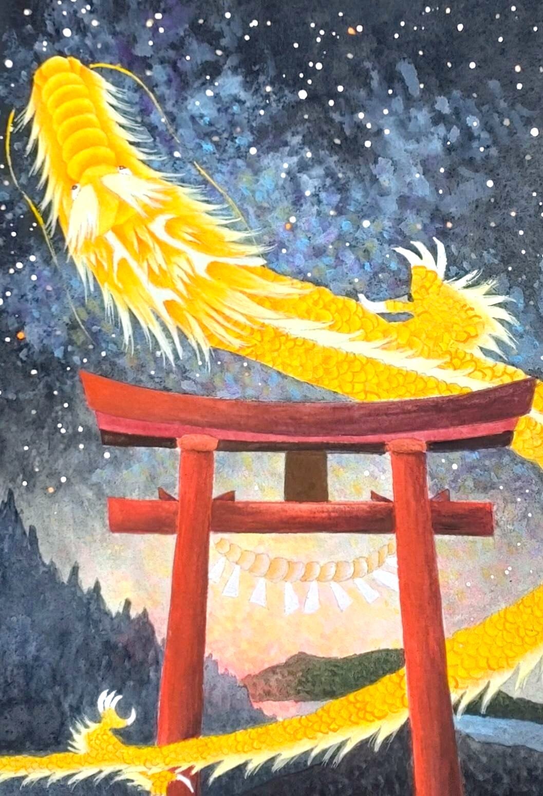 手描きで表現された『天を翔ける』は、鳥居をくぐり天へと舞い上がる金龍が描かれた絵です。この作品は、見る人に幸運と開運のエネルギーを与え、日常生活に希望と夢をもたらすことでしょう。金龍は、天へと向かう姿が力強く、特別な存在感を持っているため、あなたの空間を豊かに演出します。手描きの1点物であり、その温もりある色使いが、どんなインテリアにも調和し、心地よい雰囲気を生み出します。鹿児島県日置市大汝牟遅神社にて祈願しております。