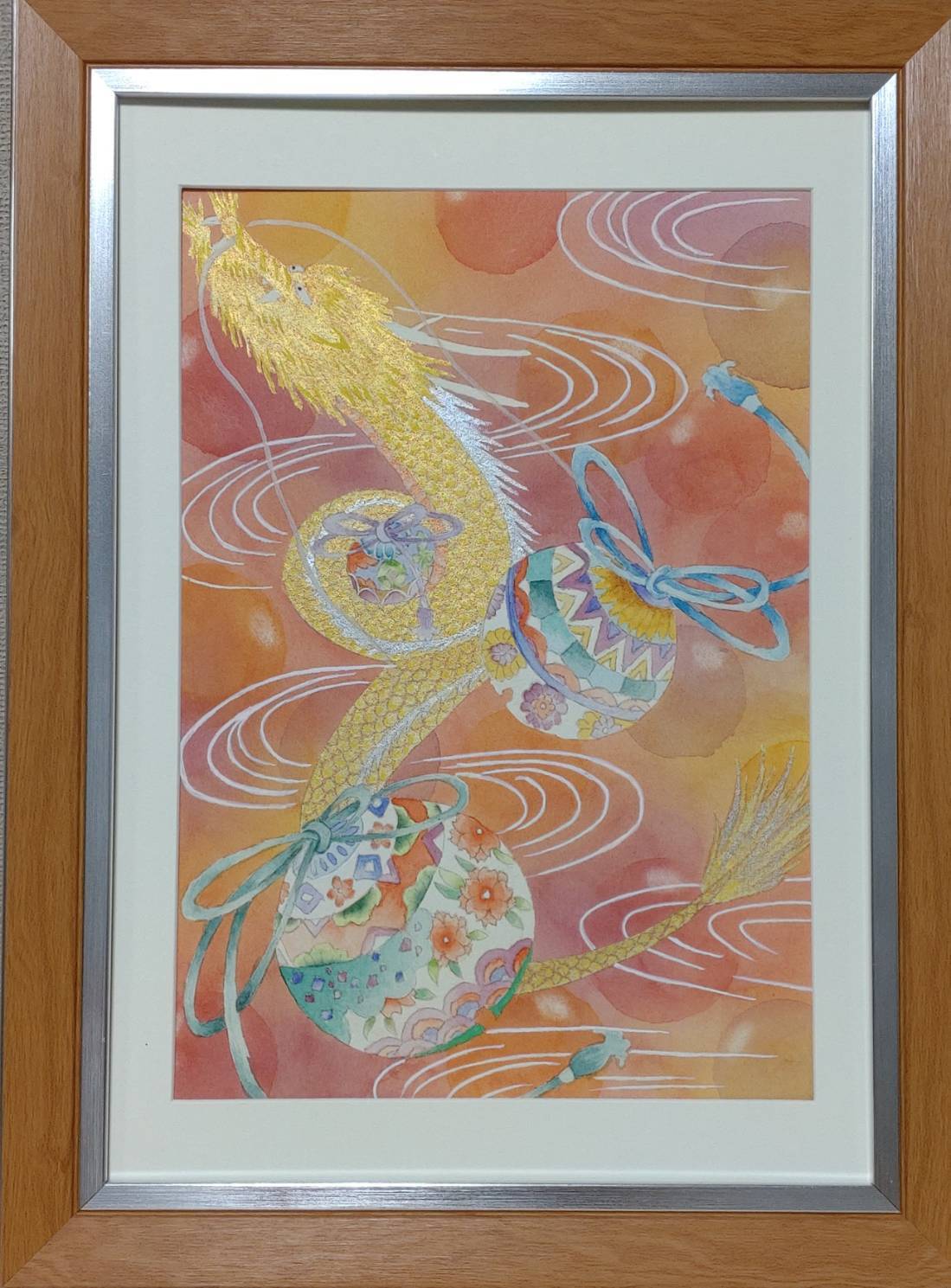 着物の古典柄の中から「鈴」を金龍様に抱かせた独特の龍神様の作品です。