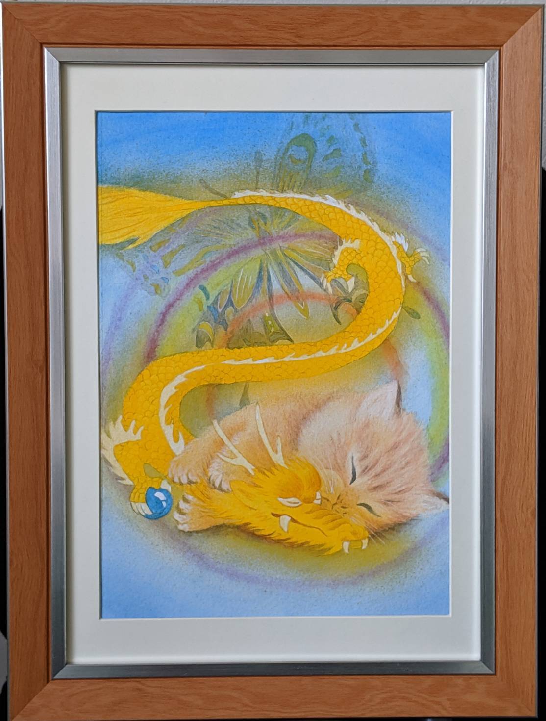 なんと龍神様と子猫が一緒にお昼寝。。。癒されますね。龍神様と言えば厳つい顏された絵が多い中、この絵はほのぼのとした気持ちが和む、そんな感じです。バックには縁起が良いとされる蝶も舞っていて、癒される作品です。手描きの1点物です。鹿児島県日置市大汝牟遅神社にて祈願しております。