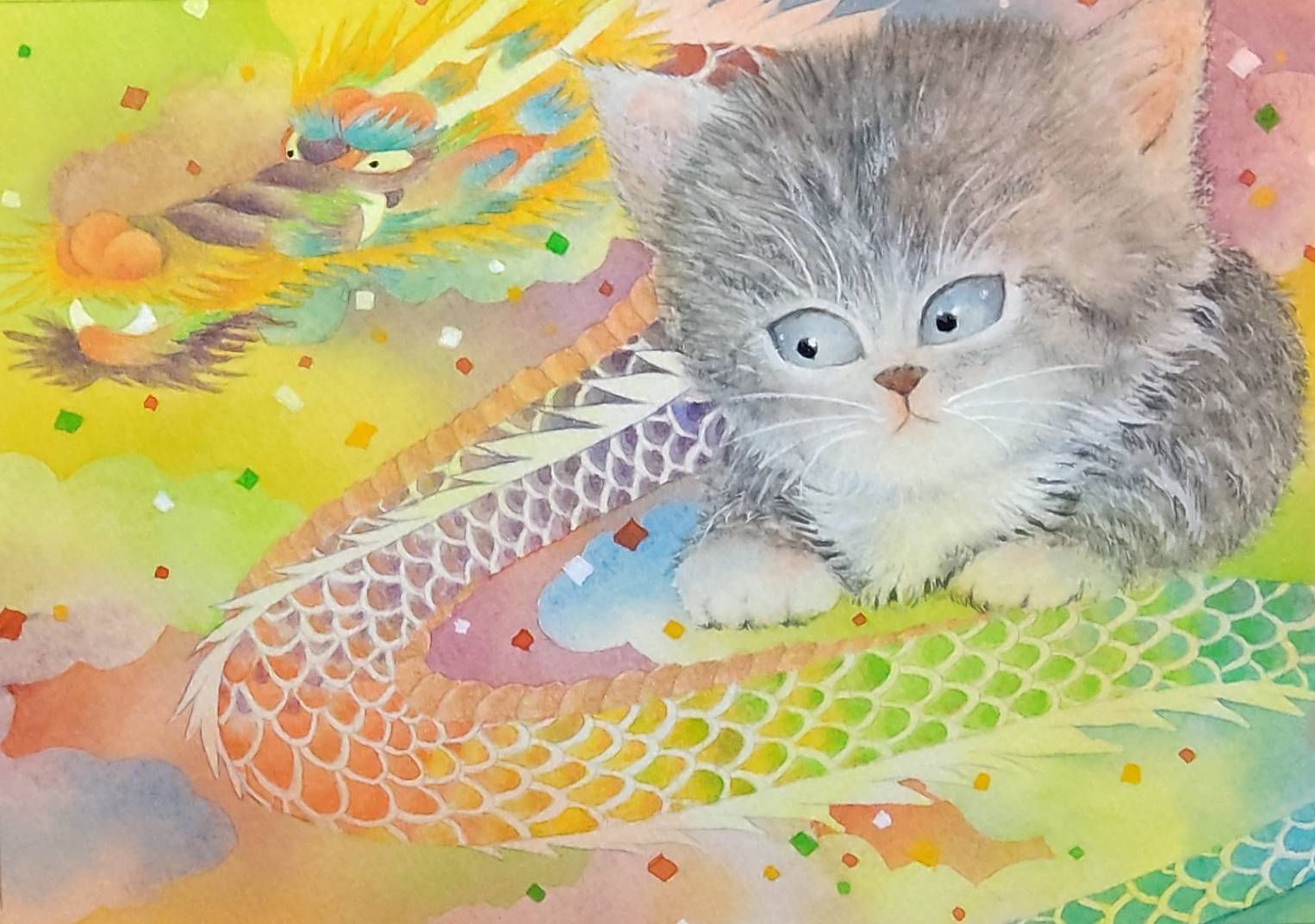 レインボーカラーの龍神様と可愛らしい猫ちゃんとのコラボ。カラフルな龍神様はあまりみない龍神様です。写真では分かりませんが。。。光に当てるとキラキラと龍神様が光ります(^^♪猫は霊的な存在とも言われております。心躍るワクワク感が伝わってくる作品です。これからの生きていく世界が楽しい世界であること願って、作者が思いを込めて描きました。手描きの1点物です。鹿児島県日置市大汝牟遅神社にて祈願しております。