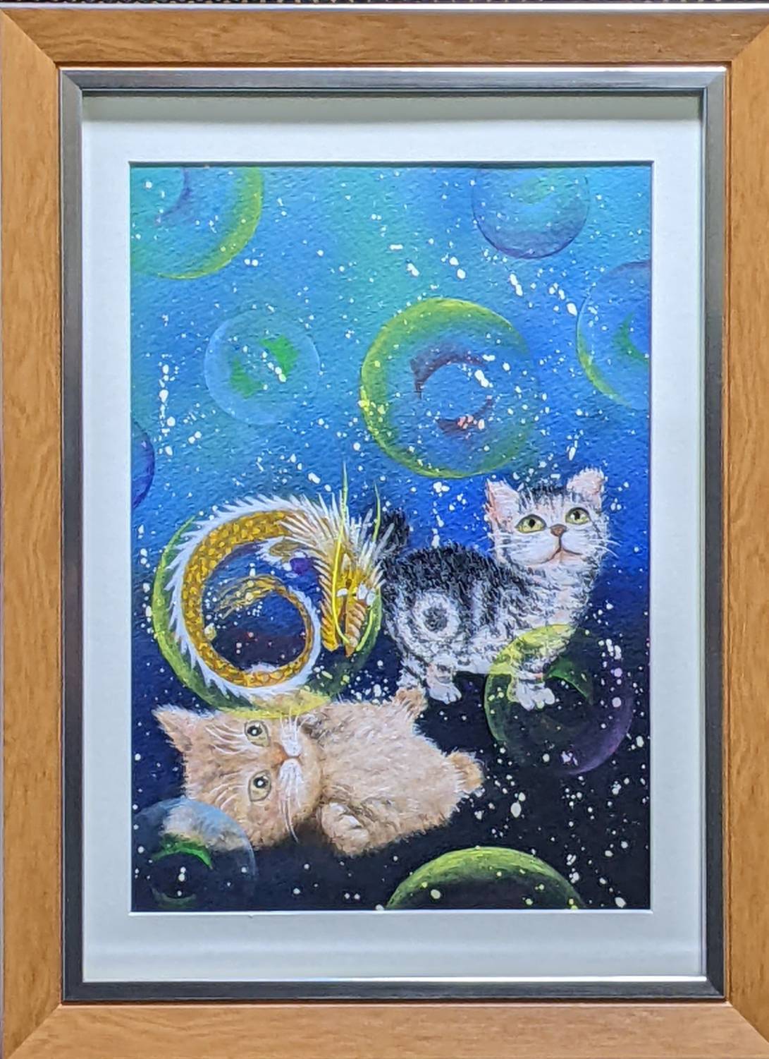 龍神様と猫シリーズ。愛らしい猫ちゃん2匹が龍神様と戯れている、なんとも「ほっこり」してしまう絵です。ご自分のお部屋に飾られてクスッと笑ってみてください。笑う門には福来るですよ。