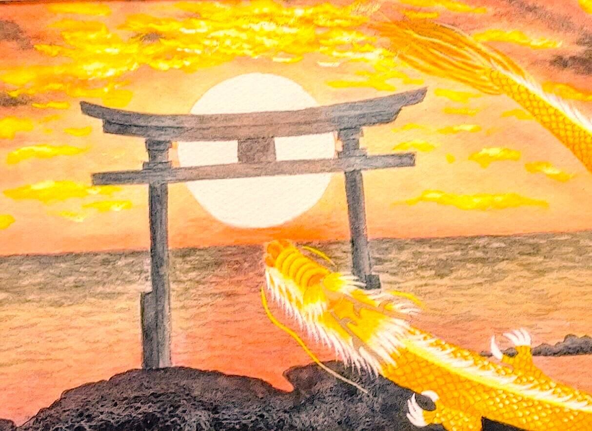 手描きの絵で表現された「祈願」は、鳥居と龍神様が描かれた神秘的な作品です。龍神様が持つ開運の力と鳥居がもたらす安らぎが融合し、昇る朝日が希望をもたらしてくれます。。日常生活の中で、ポジティブなエネルギーをもたらし、心を癒してくれることでしょう。手描きの1点物です。鹿児島県日置市大汝牟遅神社にて祈願しております。