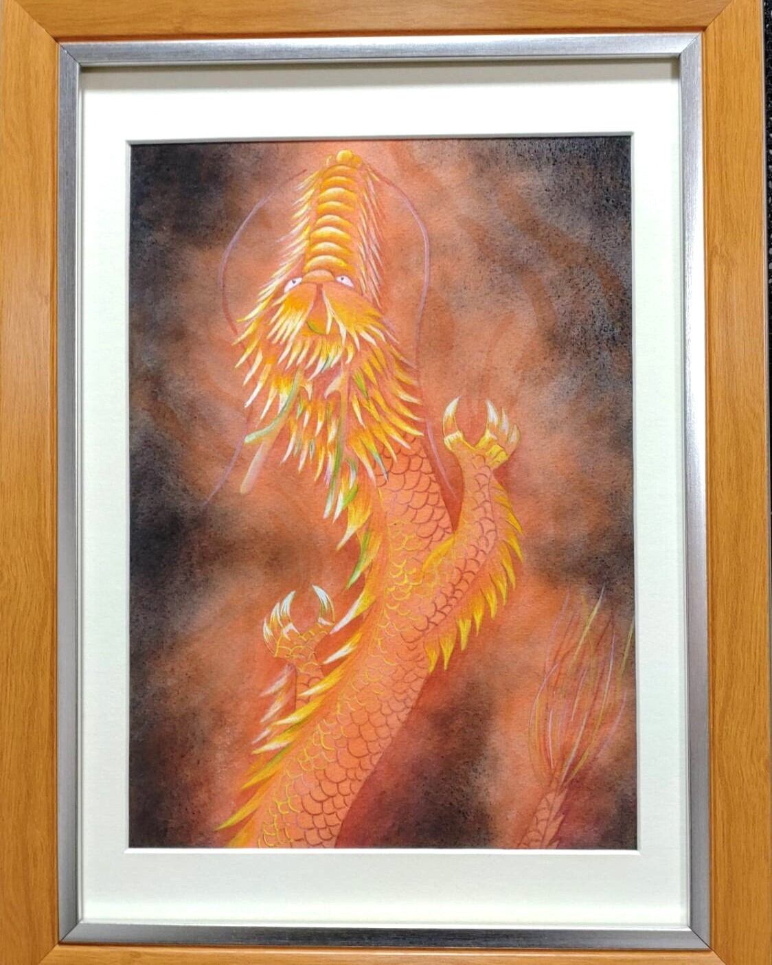 手描きの絵で表現された「情熱」は、力強い龍神様が描かれた魅力的な作品です。昇龍の姿が象徴する運気の流れと、手描きの温もりが融合し、観る人に開運と招福のエネルギーを届けます。鮮やかな色合いが日常生活に彩りを添え、心を豊かにしてくれることでしょう。手描きの1点物です。鹿児島県日置市大汝牟遅神社にて祈願しております。
