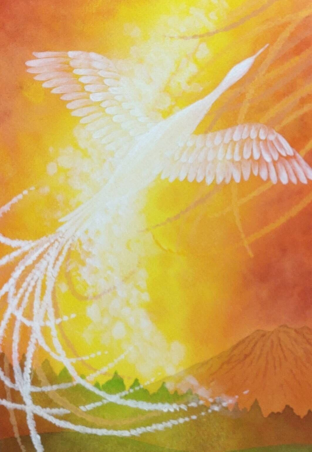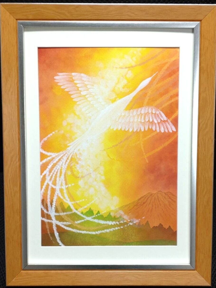「光に向かいて」は、華やかな鳳凰が描かれた心温まる手描きの作品。鳳凰が象徴する希望や幸、そして開運のエネルギーが結集し、見る人に明るい未来へ導く力を与えてくれます。細やかな手描きの技法が施されており、日常生活に特別な彩りを添えることでしょう。手描きの1点物です。鹿児島県日置市大汝牟遅神社にて祈願しております。